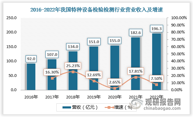 特种设备具有危险性大,对安全性要求高等特点,是质量检验检测重点应用下游领域之一。近年来随着特种设备需求量增加,我国特种设备检验检测行业快速发展,2022年营业收入达到196.3亿元,同比增长7.5%。